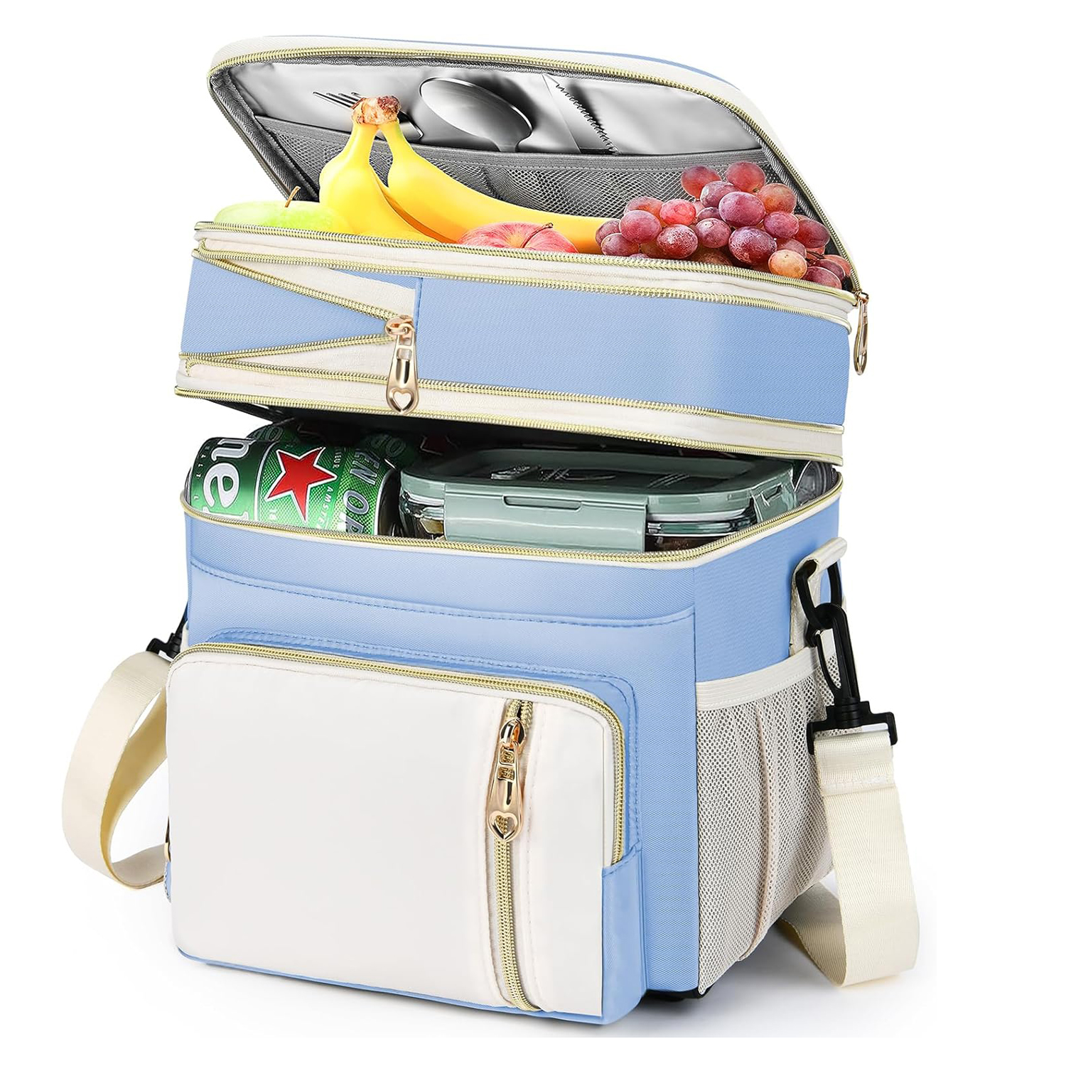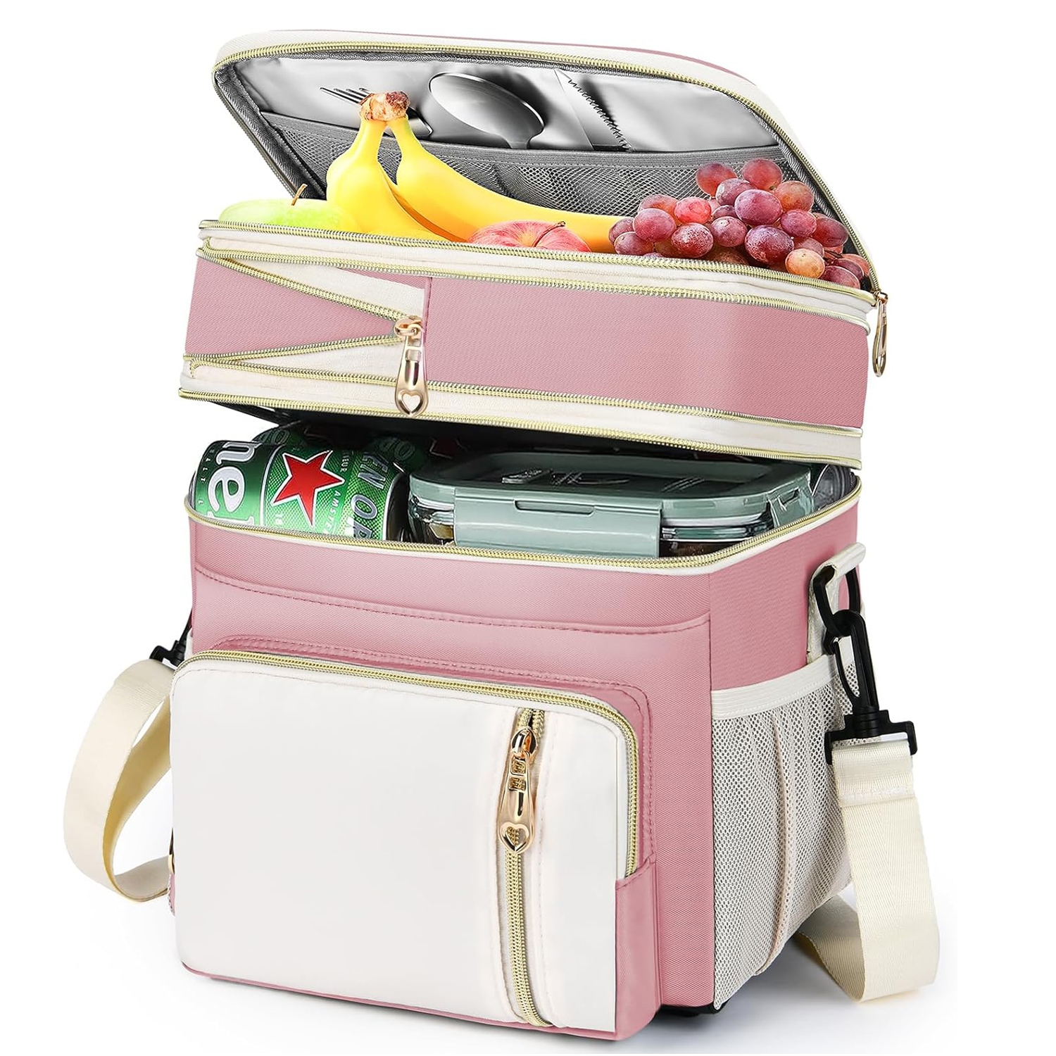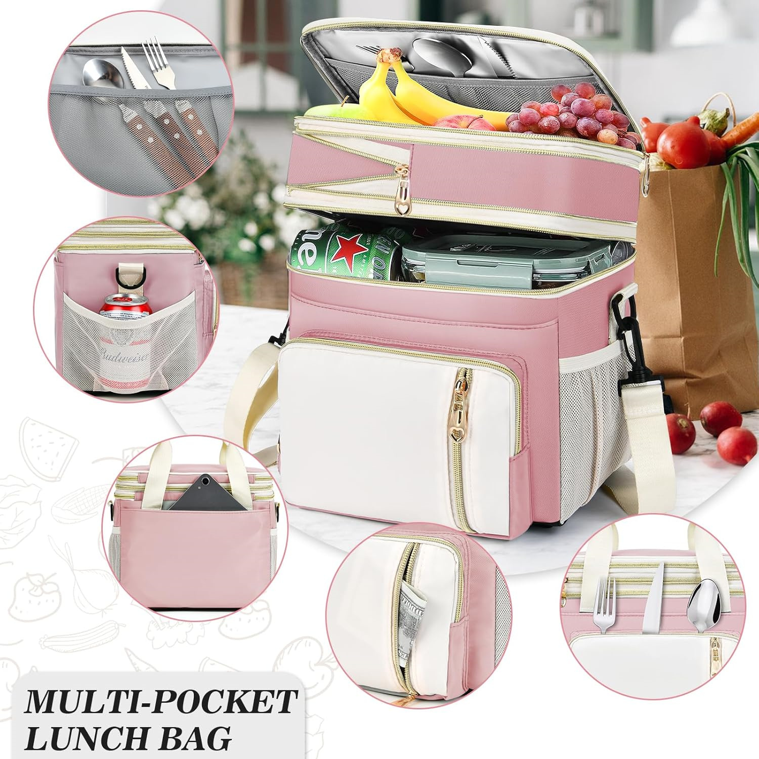 【多口袋】上部内部有一个网袋,可以放置各种餐具,如刀、叉子、勺子等。 这款大号午餐盒有两个侧袋,侧面网袋可以存放雨伞或水瓶。 前口袋可以放置钥匙或手机,也可以轻松找到其他常用物品。 还有一个背面防盗口袋,可放置现金或硬币。 :