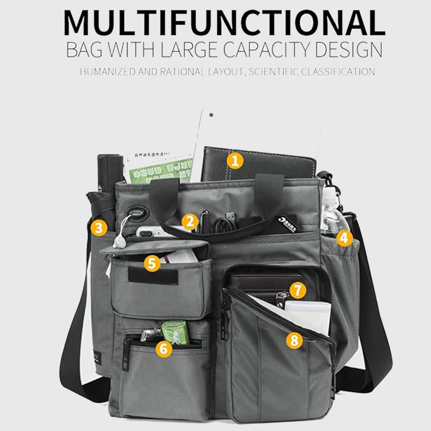 【丰富实用的口袋】这款男式邮差包共有 9 个多功能口袋;2 个侧袋可放置水瓶和雨伞。 构造精良,1 个加垫笔记本电脑隔层保护您的 15.6 英寸笔记本电脑免受意外碰撞。 1 个有序隔层和 4 个小口袋让您的小物品更容易找到。 背面还有一个大的隐藏口袋。 :